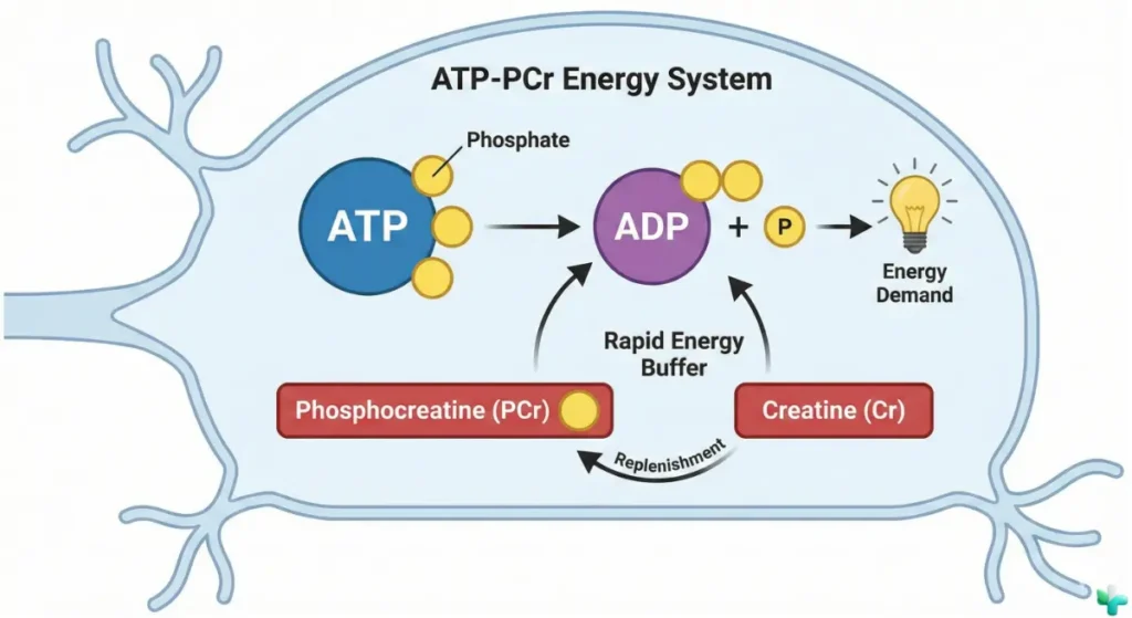 Think of creatine like a rechargeable power bank for cells. Your body uses ATP as its “spendable energy.” The problem is ATP gets used quickly, especially during short bursts of high demand—like intense exercise, but also heavy thinking, stress, and sleep loss.
