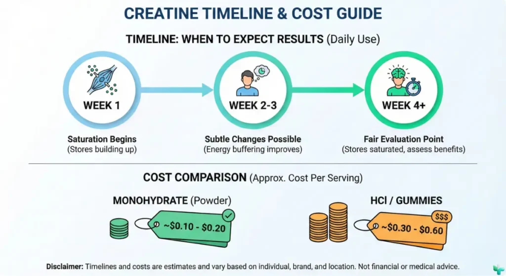 The reality: Creatine usually isn’t an instant “feels like caffeine” supplement. A fair trial is often 2–4 weeks of daily use—plus actually fixing sleep, hydration, and nutrition basics. Some people never “feel” it but still show objective improvements on cognitive tests.[2]
