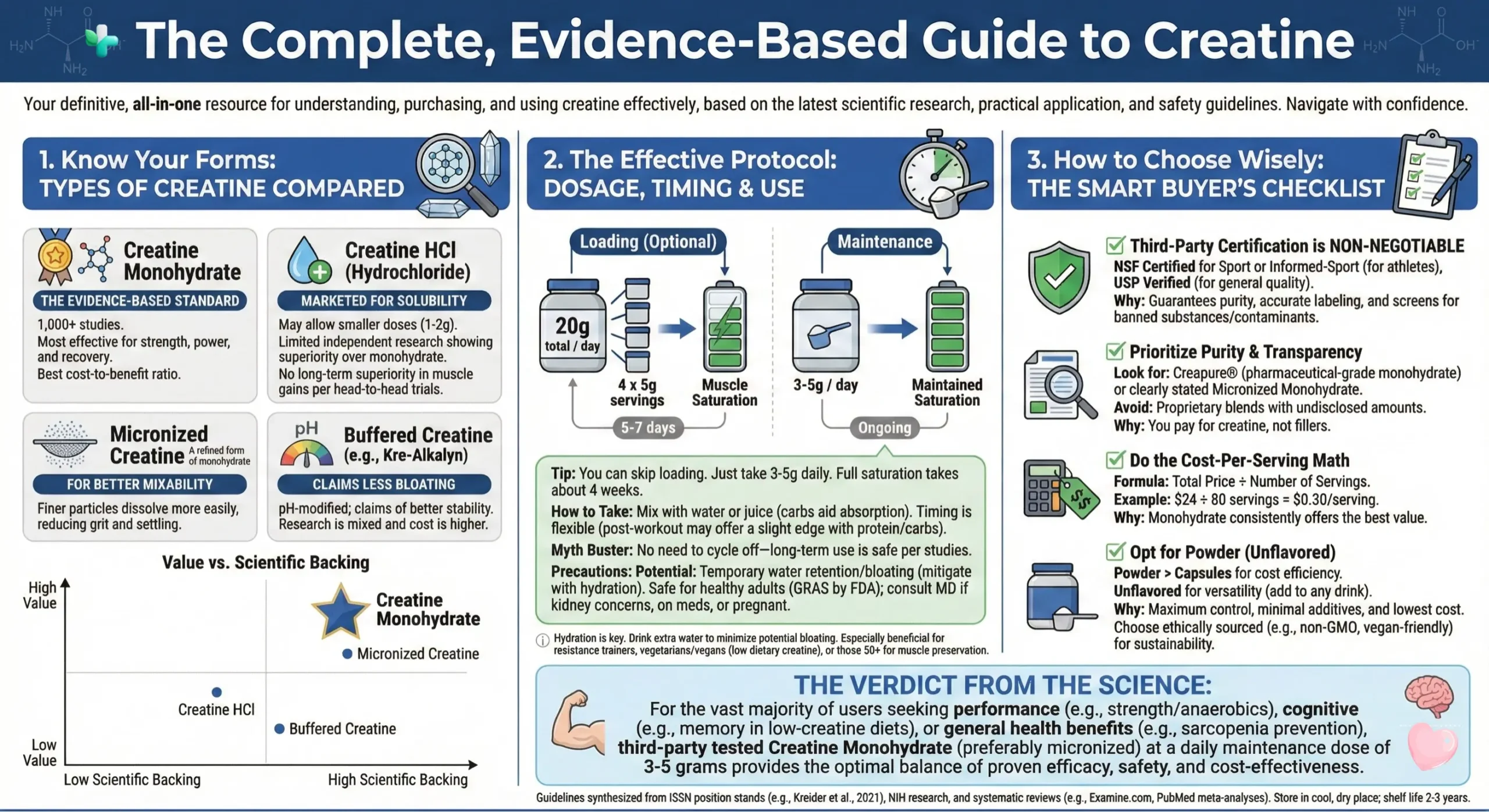 - Monohydrate is still the best first pick for most people (~$0.10-0.20/day).